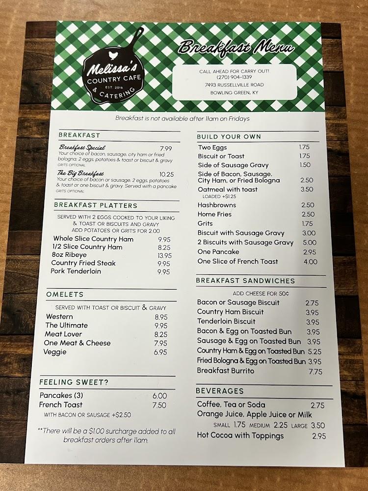 Welcome to Melissa's Country Cafe, your cozy home-style restaurant nestled in Bowling Green, KY. We take pride in offering a diverse menu full of delicious daily specials made in-house, ranging from hearty breakfasts to delightful desserts. Enjoy our relaxed atmosphere, perfect for groups, tourists, or solo dining. With options for takeout, dine-in, and delivery, we cater to every need. Our accessible facilities ensure all guests feel welcomed. Whether you’re craving comfort food or healthy choices, Melissa's offers it all at an affordable price. Visit us today at 7493 Russellville Rd for a memorable culinary experience!